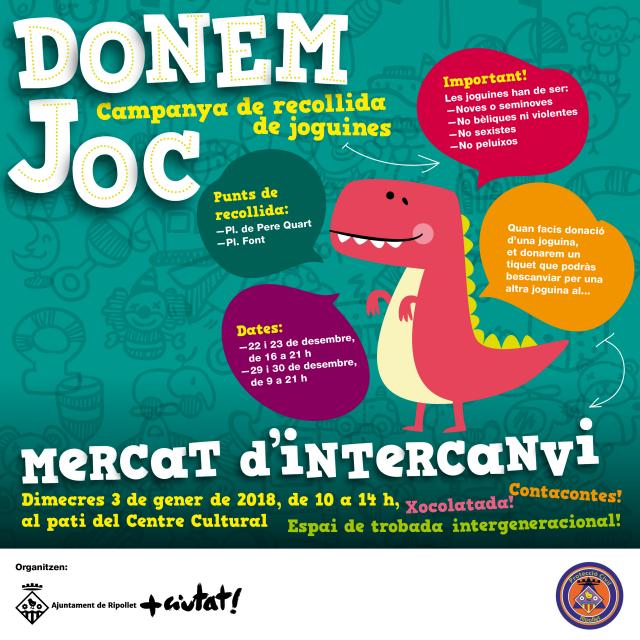 En el moment de la donació, s'entregarà un tiquet que es podrà bescanviar per una altra joguina al mercat d'intercanvi del 3 de gener, al pati del Centre Cultural, de 10h a 14h. Hi haurà una xocolatada popular i sessió de contacontes.