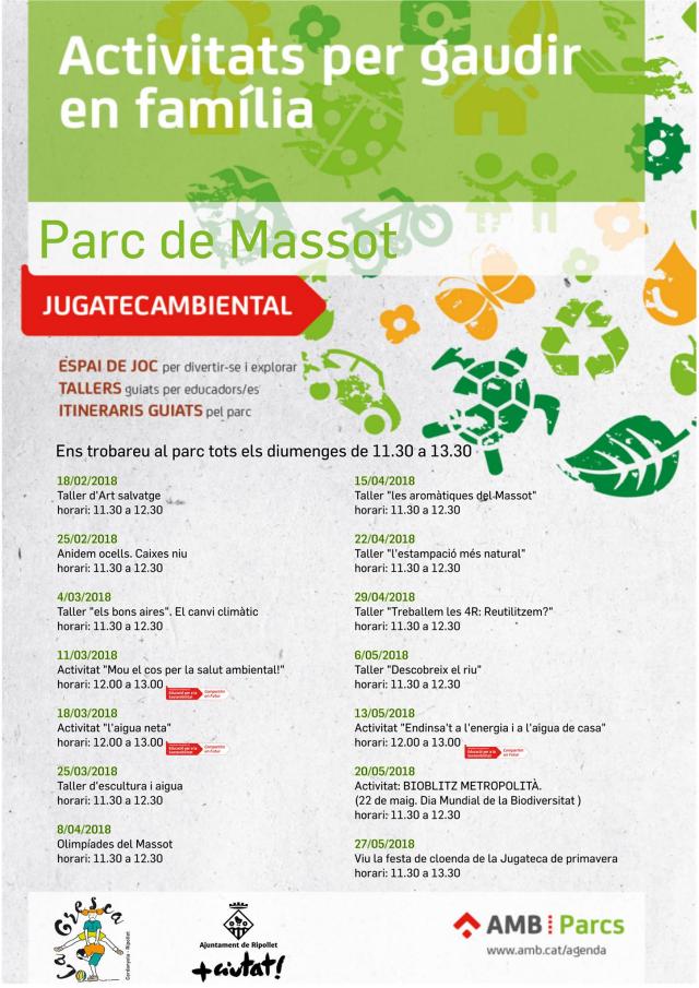 | Jugatecambiental Parc Massot: "Mou el cos per la salut ambiental" | | | Dins el programa metropolità d'Educació per a la sostenibilitat. L'activitat es farà de 12 a 13 h, a càrrec del Centre d'Esplai La Gresca. |