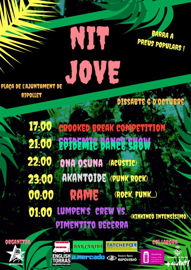 El dissabte, dia 6 d'octubre, arriba la Nit JOVE a Ripollet. A les 17 h, ´crooked break competition´ i, a les 21 h, actuació d´Epidemic Dance Show. A partir de les 22 h, concerts d´Ona Osuna, Akantoide i Rame i, per acabar, sessió de Djs amb Lumpen´s Crew i Pimentito Becerra. Servei de bar a preus populars. Hi col·labora el Casal de Joves i la Regidoria de Joventut.