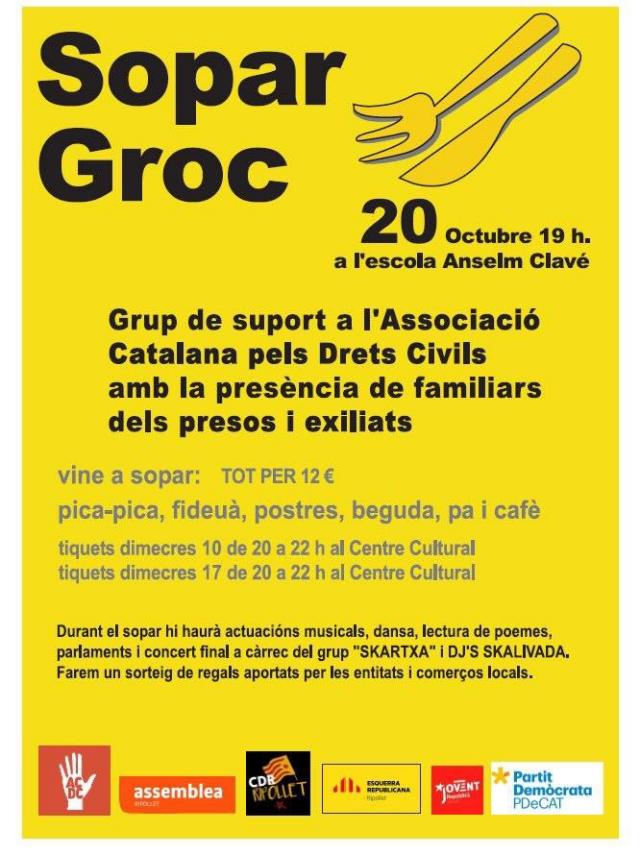 Presentació As. Catalana pels Drets Civils - Sopar GrocAuqest dissabte, 20 d'octubre, l'Associació Catalana pels Drets Civils organitza un sopar groc solidari al pati de l'escola Anselm Clavé. L'acte es farà de les 19 a les 21.30 h, i comptarà amn la presència de la presidenta de l'ACDC, Meritxell Lluís, i Xavier Sánchez, ambdós representants dels familiars dels presos i exiliats. Després de l'acte, es farà un concert a càrrec de grups locals i un sorteig amb participació solidària. Hi seran presents familiars d'alguns presos o exiliats relacionats amb el procés independentista català. Totes les persones que participen a l'acte ho fan a títol individual.