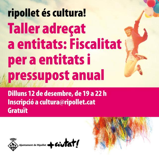 | Taller per a entitats: Fiscalitat per a entitats i pressupost anual | | | Taller adreçat a entitats culturals locals. Cal inscripció prèvia a cultura@ripollet.cat.