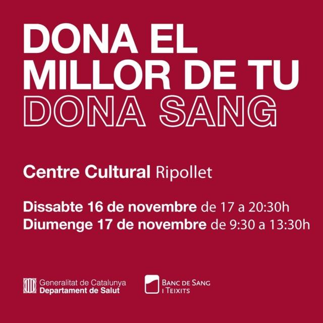 | Campanya de donació de sang | | | El dissabte 16 de 17 a 20.30 h, el diumenge 17 de 9.30 a 13.30 h. |