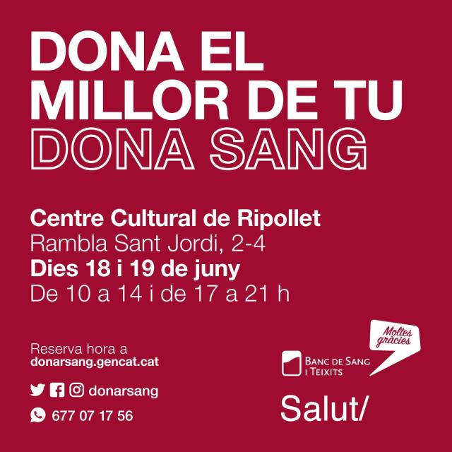 | Campanya de donació de sang | | | Divendres 18 i dissabte 19 de juny, de 10 a 14 i de 17 a 21 h. Cal reservar hora a donarsang.gencat.cat |