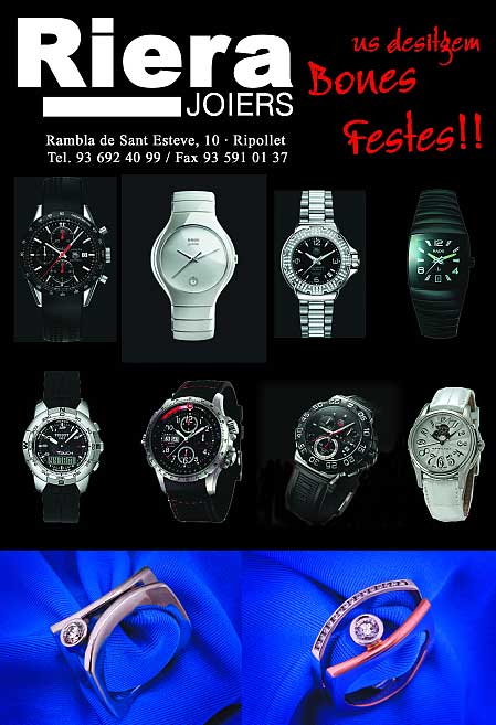 Concesionari oficial de Tag Heuer, Rado, Hamilton, Tissot, Maurice Lacroix, Certina, CK, Tommy Hilfiger, Nike, Montblanc, Swarovski, Lotus, etc. Dissenys propis, joies per encàrrecs, últimes novetats en joieria i rellotgeria. Servei garantit de reparació de joies i rellotges.