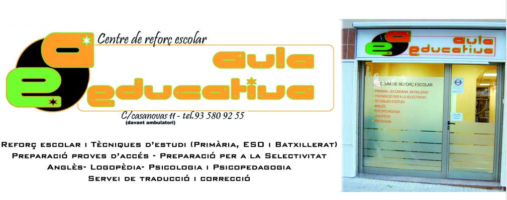 Aula Educativa -Reforç escolar: Primària, E.S.O, Batxillerat i tècniques d'estudi. -Preparació per a les proves d'accés a: Selectivitat, Cicles Formatius, G.E.S i majors de 25 anys. -Anglès nens i adults -Logopèdia, Psicologia, Psicopedagogia.