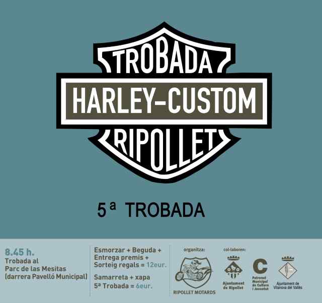 El proper diumenge, 18 de maig, se celebra al parc de Gassó Vargas de Ripollet la cinquena trobada de Harley-Custom. L'activitat està organitzada per Ripollet Motards i compta amb el suport de l'Ajuntament de Ripollet i de l'Ajuntament de Vilanova del Vallès.