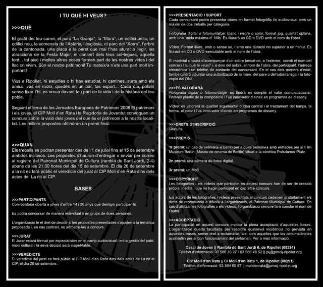 Aquest concurs, adreçat a joves entre 14 i 30 anys, pretén copsar de quina manera veuen els joves ripolletencs el patrimoni del seu poble. Cal tenir en compte que per patrimoni s'entén allò que ens identifica com a col·lectiu i, que per tant, pot ser un edifici però també una festa o qualsevol altra manifestació tangible o intangible. Els joves, de manera individual o en grups de dues persones, podran presentar obres de fotografia digital o fotomuntatges i/o muntatges audiovisuals d'una durada màxima d'un minut, al registre del Patronat Municipal de Cultura, a la rambla de Sant Jordi 2-4, fins a les 21.00 hores del dia 15 de setembre.