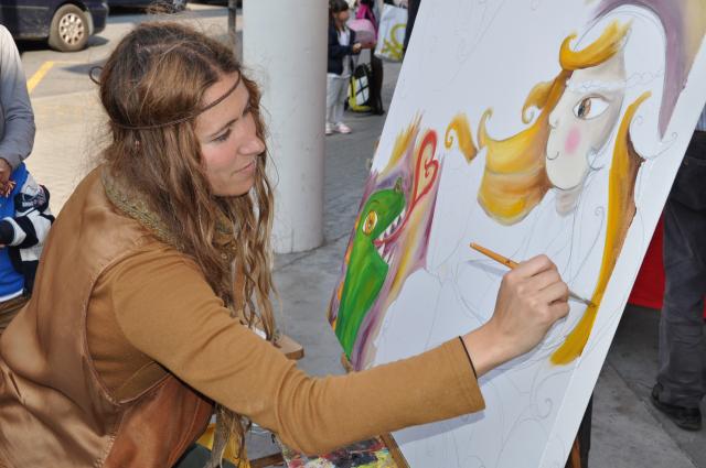 - L'autora i ilustradora, Alba Martínez, realitzant pintura en viu a la parada del Centre Cultural, aquest Sant Jordi.