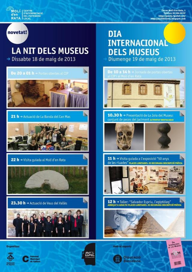 A les 20 hores s'obrirà el complex museístic local, que restarà obert fins la 1 de la matinada. Durant aquest horari especial hi haurà diferents actuacions i activitats: a les 21 hores la Banda del Can Mas, a les 22 hores es farà una visita guiada al Molí i a les 23.30 hores hi haurà un recital de Veus del Vallès.