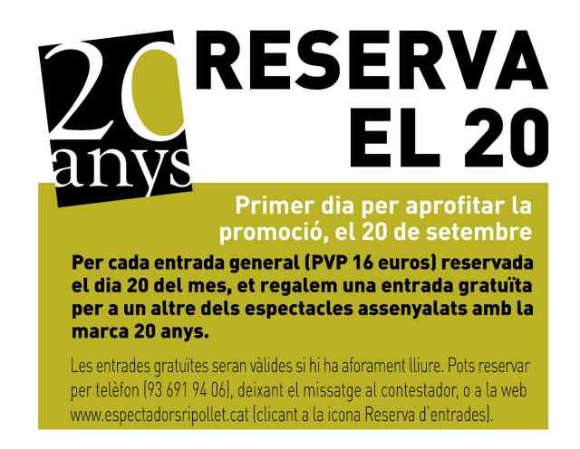- Si reserves la teva entrada el dia 20 de cada mes, de regal una altra entrada per un altre espectacle.