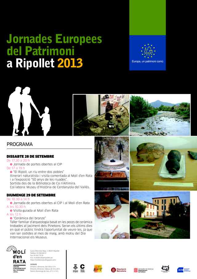 Els propers 28 i 29 de setembre, Ripollet participa de nou a les Jornades Europees de Patrimoni. El CIP Molí d'en Rata acollirà diferents activitats per tal de difondre i donar a conèixer el seu contingut. Les primeres activitats seran dissabte 28 de setembre, a partir de les 17.30 h, amb 'El Ripoll, un riu entre dos pobles', itinerari naturalista i visita comentada al Molí. També a la mostra dels '50 anys de les riuades' .A partir de 2/4 de sis de la tarda i fins a les vuit del vespre hi haurà jornada de portes obertes al CIP