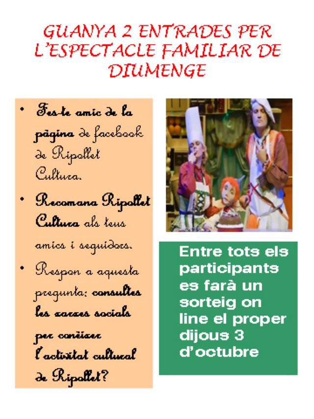 Des del Facebook de Ripollet Cultura, el Patronat Municipal de Cultura ha posat en marxa un concurs per guanyar dues entrades per l'espectacle familiar del proper diumenge 6 d'octubre al Teatre Auditori.