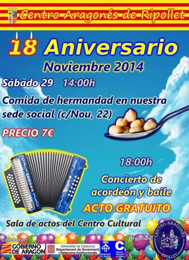 El dissabte, 29 de novembre, el Centro Aragonés de Ripollet celebrarà el seu 18è aniversari. A les 14 hores es realitzarà un dinar de germanor a la seva seu social (carrer Nou, 22), que té un preu de 7 euros. A les 18 hores s'iniciarà al Centre Cultural un concert d'acordió i ball. Aquest darrer acte és gratuït i tindrà lloc a la Sala d'Actes.