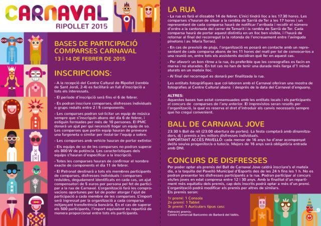 Ja s'han fet publiques les bases per participar a la Rua de Carnaval 2015, que tindrà lloc el dissabte, 14 de febrer. Les inscripcions s'han de realitzar al Centre Cultural fins el 6 de febrer. Es podran inscriure comparses, disfresses individuals i grups reduïts d'entre 2 i 5 persones. Les comparses formades per més de 10 components podran solicitar equip de música i aquelles que l'hagin de llogar rebran una ajuda del Patronat Municipal de Cultura. El PMC també destinarà 5 euros per persona a tots els ripolletencs que participin a la rua.