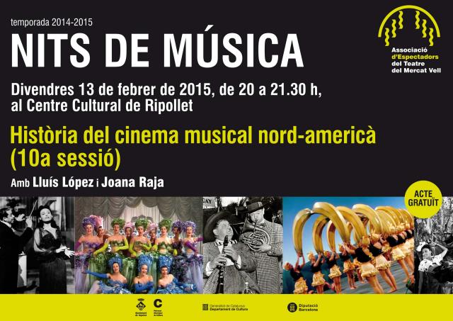 Aquest divendres, 13 de febrer, Nits de música oferirà la desena sessió sobre la història del cinema musical nord-americà, reprenent així aquest tema, de la mà de Joana Raja i Lluís López. L'activitat, organitzada per l'Associació d'Espectadors del Teatre del Mercat Vell, estarà coordinada, com sempre, per Ángel Esteve i Rafael López.