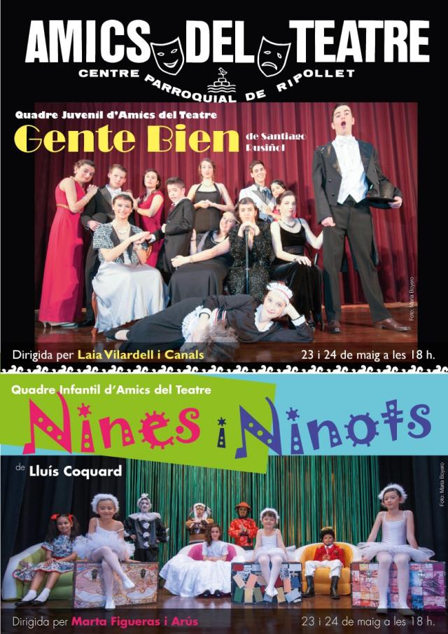 D'altra banda, dissabte 23 i diumenge 24 de maig, el Quadre juvenil d'Amics del Teatre estrenarà 'Gente Bien', de Santiago Rusiñol, sota la direcció de Laia Vilardell; mentre que el Quadre infantil presentarà 'Nines i Ninot's, de Lluís Coquard, dirigida per Marta Figueras. Les representacions seran a partir de les 6 de la tarda.