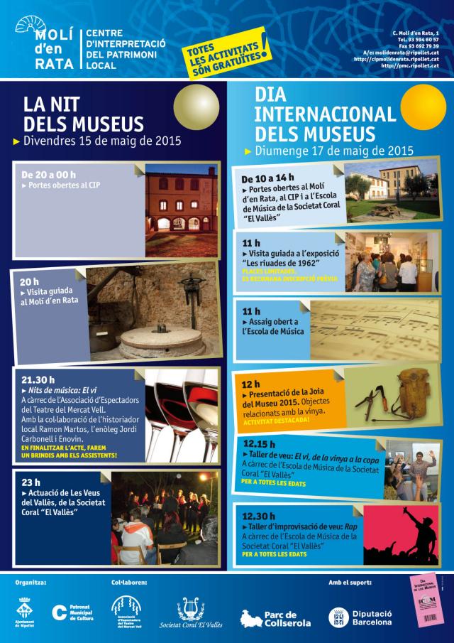El CIP Molí d'en Rata és un dels 65 museus de 52 municipis de la província de Barcelona adherits a la Xarxa de Museus Locals, que un any més s'afegeixen a la commemoració del Dia Internacional dels Museus, obrint les seves portes i programant diverses activitats. A Ripollet, la vinya i la música seran els elements protagonistes de les activitats d'enguany.