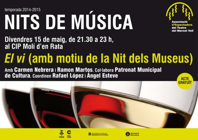 L'Associació d'Espectadors del Teatre del Mercat Vell oferirà a les 21.30h una sessió especial de Nits de Música, sota el títol 'El vi i la música'. L'activitat comptarà amb la participació com a convidats de l'historiador local Ramon Martos i de l'enòleg Jordi Carbonell, col·laborador d'Enovin.