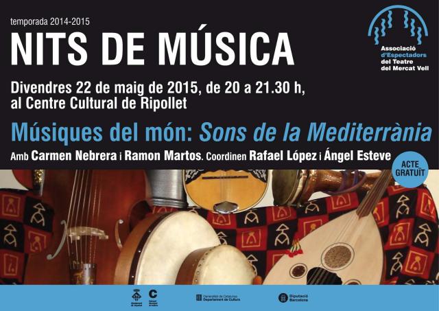 Aquest divendres, 22 de maig, el Centre Cultural acull una nova edició del cicle Nits de Música. Sota el títol 'Músiques del món: Sons de la Mediterrània', la vetllada girarà entorn de la música que es produeix a banda i banda del mar Mediterrani. Carmen Nebrera i Ramon Martos faran un viatge pels països banyats per la Mediterrània, a través de la seva història i la seva música: Marroc, Algèria, Tunísia, Israel, Turquia, Grècia...