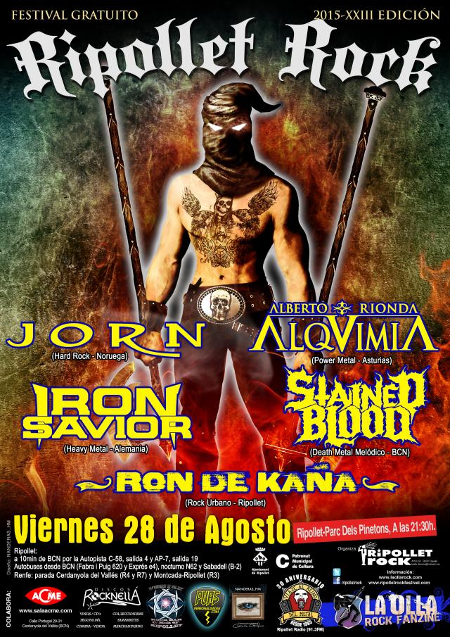 Divendres, 28 d'agost, a les 21.30 hores s'obre el teló d'una nova edició del Ripollet Rock Festival, que tindrà el seu escenari al parc dels Pinetons. El cartell d'aquesta vint-i-tresena edició l'encapçala la banda noruega Jorn. La formació de hard rock, liderada pel polifacètic vocalista Jorn Lange, és el primer grup noruec que visita Ripollet. També hi haurà bon heavy metal de la mà dels alemanys Iron Savior. Del panorama nacional arriba la banda asturiana Alquimia, el nou projecte musical d'Alberto Rionda, guitarrista i fundador d'Avalanch. El metal extrem anirà a càrrec dels catalans Stained Blood i, per altra banda, el punt de rock urbà el posarà la banda ripolletenca Ron de Kaña.
