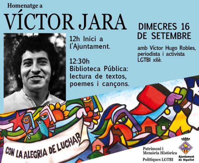 Les regidories de Polítiques LGTBI i de Patrimoni i Memòria Històrica organitzen aquest dimecres, 16 de setembre, un acte d'homenatge al cantautor xilè Víctor Jara. Enguany, es commemora el 42è aniversari del seu assassinat, que va tenir lloc el 16 de setembre de 1973 a mans de les tropes colpistes d'Augusto Pinochet durant la dictadura militar xilena.