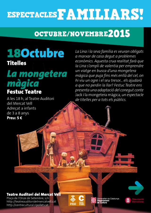 Aquest mes d'octubre s'aixeca el teló dels espectacles familiars dels diumenges al Teatre Auditori del Mercat Vell, que organitza el Patronat Municipal de Cultura. El primer espectacle que pujarà a l'escenari del Teatre Auditori serà 'La mongetera màgica', a càrrec de la companyia Festuc Teatre. Serà diumenge, 18 d'octubre, a les 18 hores. Es tracta d'un espectacle de titelles per a tots els públics, però adreçat especialment a infants de 3 a 8 anys. És una adaptació del conte popular 'Jack i la mongetera màgica' que explica la història de la Lina, una nena a la cerca d'una mongetera que la porti al cel i l'ajudi a fer que els seus pares no perdin casa seva.