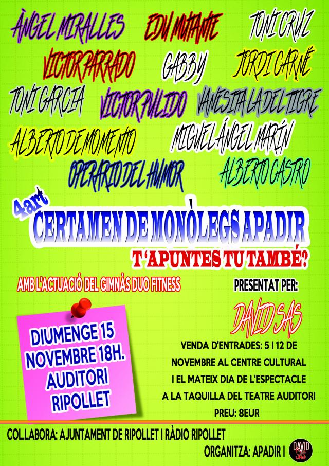 En venda les entrades per al 4t Certamen de Monòlegs Apadir