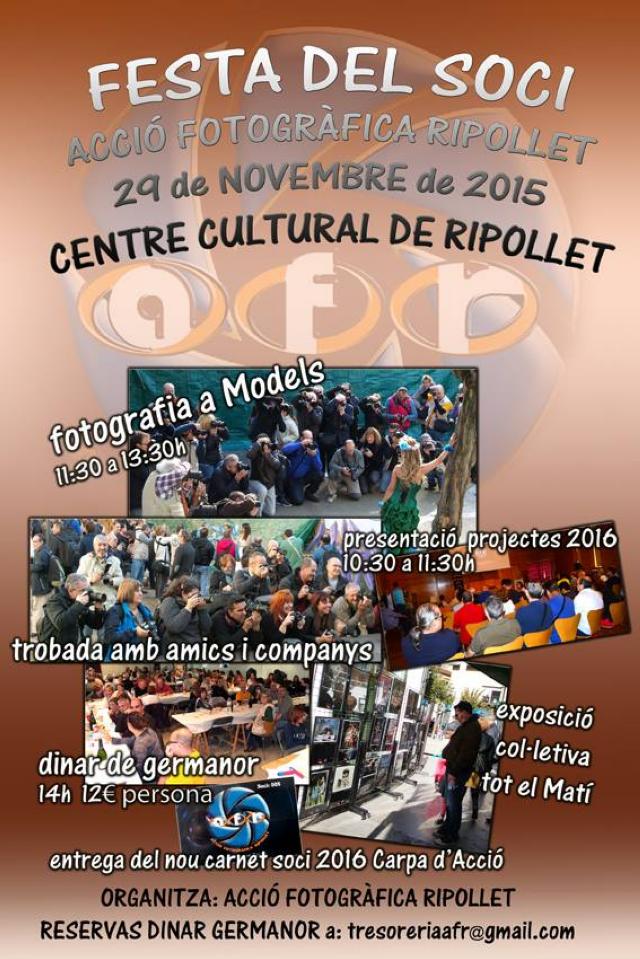 L'entitat Acció Fotogràfica Ripollet organitza, el pròxim 29 de novembre, la Festa del Soci al Centre Cultural. Una celebració que aplegarà un conjunt d'activitats diverses per als apassionats del món de la fotografia. La festa començarà a les 10.30 h amb la presentació dels projectes previstos per al 2016, en especial es pretén participar amb el comerç local de Ripollet, a través d'una col·laboració amb la Unió de Botiguers (UBR). Seguidament, tindrà lloc l'esdeveniment 'Fotografia a models', en què els fotògrafs que hi participin podran trobar la millor perspectiva de les models que faran un passi fins a les 13.30 h. Al migdia, Acció Fotogràfica té previst un dinar de germanor, que tindrà un cost de 12 € per persona. És necessari que els participants s'inscriguin al dinar via correu electrònic a tresoreriaafr@gmail.com.