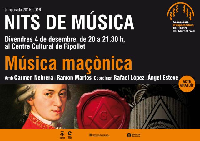 El pròxim divendres 4 de desembre tindrà lloc al Centre Cultural una nova edició de les Nits de Música sobre melodies i cants maçònics. L'Associació d'Espectadors del Teatre del Mercat Vell organitza aquest esdeveniment gratuït i d'entrada lliure sobre melodies i cants maçònics de Mozart, Sibelius i Beethoven, entre d'altres. També hi haurà cançons i lletres interpretades o fetes per personatges maçònics com Nat King Cole, Duke Ellintong, Antonio Machado i Louis Amstrong.