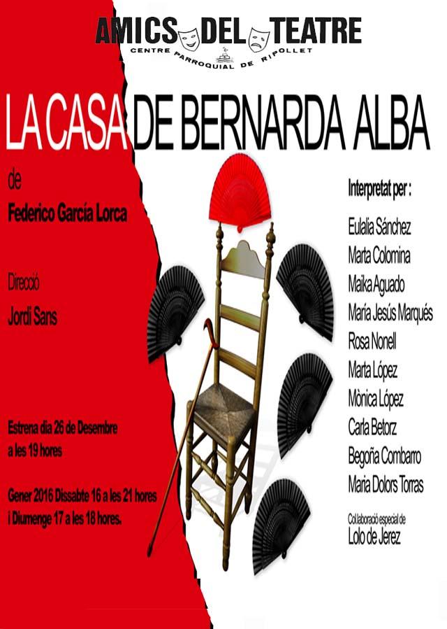 L'entitat Amics del Teatre tornarà a pujar aquest cap de setmana a l'escenari del Centre Parroquial, on representarà l'obra La casa de Bernarda Alba, de Federico García Lorca. Es tracta d'una versió dirigida per Jordi Sans, amb una desena d'actors i actrius de la companyia, i la col·laboració especial de Lolo de Jerez. L'obra es va estrenar a finals del mes de desembre. En aquesta ocasió la representaran dissabte, 16 de gener, a les 21 hores, i diumenge 17 de gener, a les 18 h. L'obra es converteix en la primera de les activitats de l'Any Lorca a Ripollet.