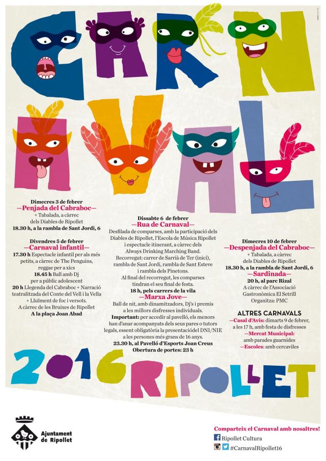 Dimecres 3 de febrer al vespre, es va donar el tret de sortida de la festa del Carnaval amb la penjada del Cabraboc del balcó de Ripollet Ràdio. La penjada va estar acompanyada per una tabalada a càrrec dels Diables de Ripollet. L'edició d'aquest any serà una de les més participatives dels darrers anys. A la rua de dissabte, 6 de febrer, s'hi han inscrit un miler de persones, en 16 comparses i una disfressa individuals.