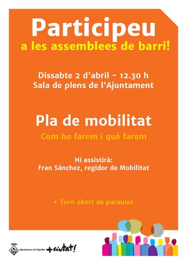 Aquest dissabte, 2 d'abril, se celebra una nova assemblea de barri. En aquesta ocasió el tema central és el Pla de Mobilitat de Ripollet, que s'ha debatut en el passat ple, celebrat aquest dijous 31 de març. Sota el títol 'Pla de Mobilitat. Com ho farem i què farem', el regidor Fran Sánchez detallarà els elements d'aquest document i esvairà els dubtes dels veïns i veïnes que hi assisteixin. Al final, hi haurà un torn obert de paraules, en el qual el regidor de Mobilitat podrà esclarir els últims detalls d'aquest Pla.