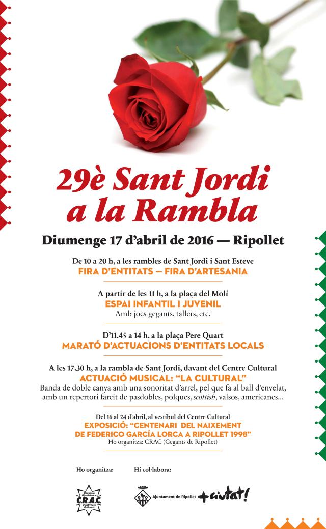 Aquest diumenge se celebra el Sant Jordi a la Rambla, la gran fira d'entitats a les rambles de Sant Jordi i Sant Esteve, organitzada per la CRAC amb la col·laboració de l'Ajuntament, que tradicionalment té lloc el diumenge anterior a Sant Jordi. Aquesta 29a edició comptarà amb la participació d'un total de 65 associacions (entre culturals, esportives, cíviques, polítiques, escoles, floristeries i llibreries...) i 50 parades d'artesania. A més, al llarg de la jornada s'han programat diverses activitats de promoció de la cultura popular, la gastronomia i l'associacionisme local en un marc festiu i multitudinari.