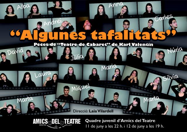 El quadre juvenil dels Amics del Teatre presenta aquest cap de setmana Algunes tafalitats, una sèrie de petites històries d'humor absurd dirigides per Laia Vilardell i basades en Teatre de cabaret, de Karl Valentin. L'obra es podrà veure al Centre Parroquial dissabte a partir de les deu de la nit, i diumenge a les set de la tarda. El preu de l'entrada és de cinc euros.