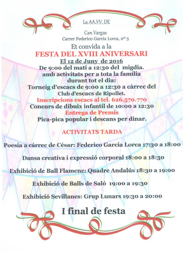 Aquest diumenge, 12 de juny, l'Associació de Veïns de Can Vargas celebra la festa del seu 18è aniversari amb un gran ventall d'activitats. La festa tindrà lloc a la seu de l'entitat, al carrer Federico García Lorca, 5.