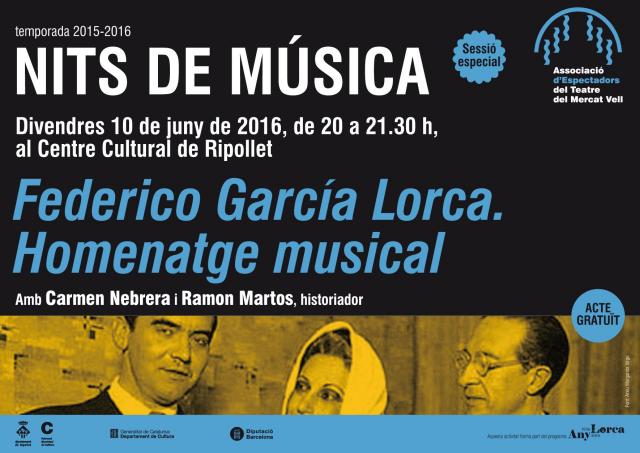 La propera edició de Nits de Música fa un homenatge a Federico García Lorca. La sessió tindrà lloc aquest divendres, 10 de juny, a les 20 hores al Centre Cultural. L'assistència és gratuïta. Aquest cop, Carmen Nerera i Ramón Martos aproparan el públic a la poesia de l'autor andalús, mitjançant peces interpretades per músics i cantants de diferents èpoques i estils.
