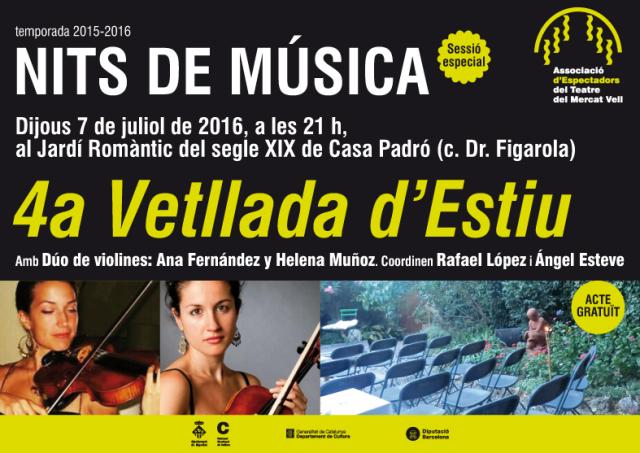 Arriba un any més la Vetllada especial d'estiu de les Nits de Música. Enguany se celebra aquest dijous, 7 de juliol, la seva 4a edició. Com altres anys, la Vetllada d'estiu tindrà lloc al jardí romàntic del segle XIX de la Casa Padró, al carrer del Dr. Figuerola. La cita començarà a les 21 hores i comptarà amb l'actuació del duet de violins format per Ana Fernández i Helena Muñoz. En el concert interpretaran peces clàssiques, però també jazz, pop i temes de cinema. La Vetllada d'estiu d'aquest dijous acomiada la temporada de les Nits de Música, una activitat gratuïta organitzada per l'Associació d'Espectadors del Teatre del Mercat Vell i coordinada per Rafael López i Ángel Esteve.