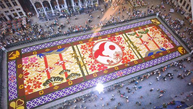 La catifa feia 100 metres de llarg per 25 d'ample, omplint tota la plaça belga. Flowers Carpet és l'entitat organitzadora de la catifa que se celebra bianualment. Enguany l'associació compleix 20 anys i ha dedicat la catifa al Japó.