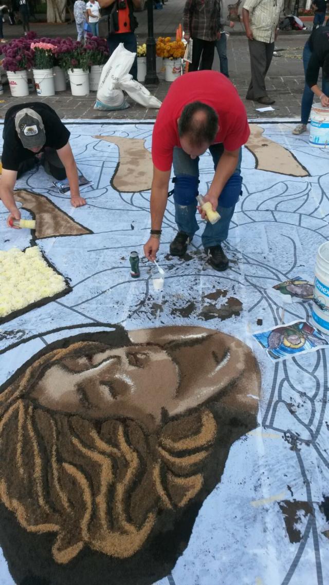 Aquesta trobada es va realitzar en el marc de Sant Miquel Arcàngel, patró de la ciutat, que omple els seus carrers de catifes de flors per a que hi passi la processó. És un tram de cinc quilòmetres totalment cobert per les catifes. La imatge de Sant Miquel que va en processó és una talla molt antiga, que varen portar els espanyols en l'època colonial. La delegació catalana va plasmar en la seva catifa un vitrall amb la representació de Sant Miquel portant en una mà les balances del bé i del mal, i a l'altra portant una espasa. El sant esclafava amb el peu al dimoni en forma de serp. Els materials que es van utilitzar van ser flors, a més de sals tenyides, terres i verd natural.