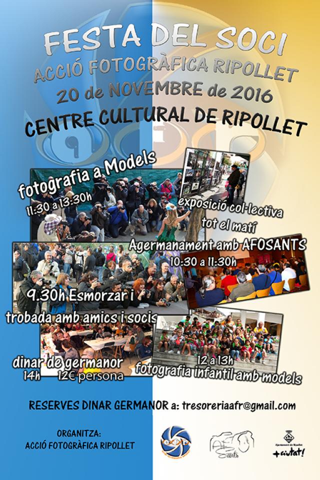 Acció Fotogràfica Ripollet organitza diumenge, 20 de novembre, una nova edició de la Festa del Soci. Serà al Centre Cultural on, durant tot el matí, es podrà veure una exposició col·lectiva. I, a les 9.30 hores s'organitzarà un esmorzar i una trobada dels amics i socis de l'entitat.
