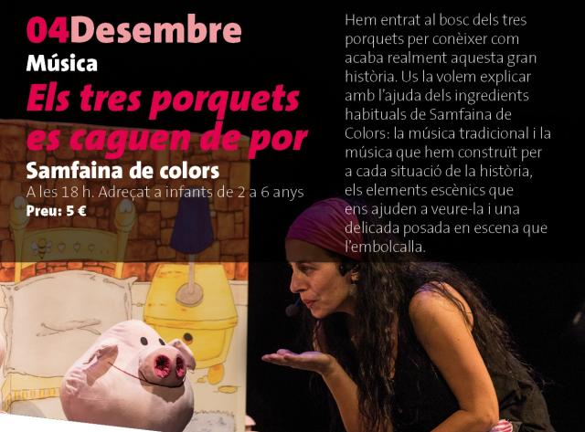 Els tres porquets es caguen de por és el títol del nou espectacle familiar del cicle Petit Mercat Vell. L'espectacle, una divertida obra musical adreçada a infants de 2 a 6 anys, es podrà veure el 4 de desembre al Teatre Auditori del Mercat Vell a partir de les sis de la tarda. L'espectacle anirà a càrrec de la companyia Samfaina de Colors, creadora de més d'una vintena d'espectacles i ha realitzat prop de 5.000 representacions i més d'un milió i mig de persones han vist les seves obres.