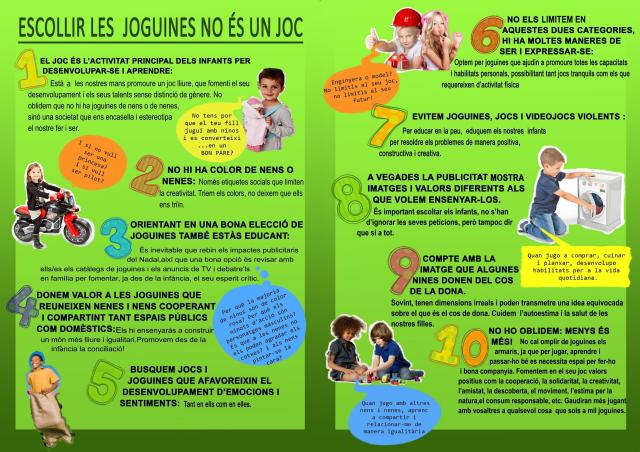 El decàleg s'ha fet arribar a tot l'alumnat dels centres educatius d'infantil i primària, de forma que les famílies triïn de forma conscient les millors joguines per als seus fills i filles. Igualment, es recorda que la joguina és una eina d'aprenentatge i interiorització de valors i escollir-la bé servirà per educar els infants en un món lliure de sexisme i violència.