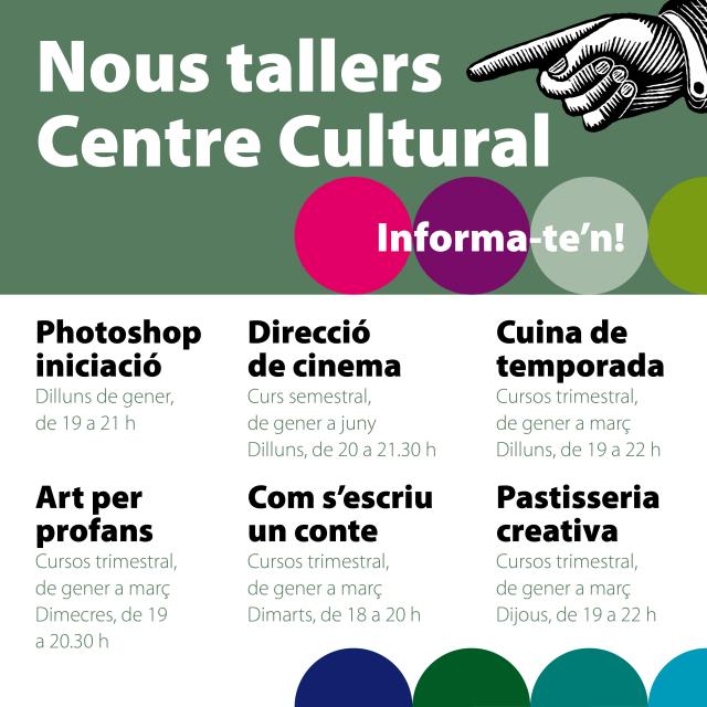 La programació de tallers i cursos del Centre Cultural es reprendrà aquest pròxim mes de gener amb algunes novetats. Una de les novetats més destacades és la incorporació de dos cursos a l'aula d'arts i pensament. Es tracta, per una banda, del taller d'art per a profans, que endinsarà els participants d'una manera molt entretinguda en la història de l'art i els permetrà aprendre a interpretar un quadre. Per altra banda, també s'estrena el taller per aprendre a escriure contes, una eina que permet a infants i adults a identificar les emocions i desenvolupar l'empatia i l'autoestima. Ambdós tallers es desenvoluparan de gener a març.