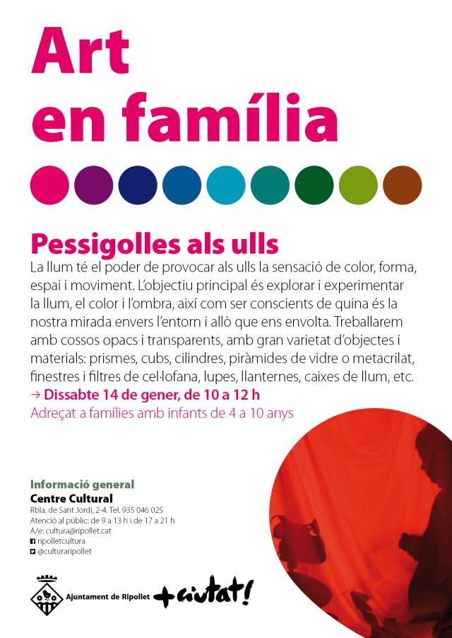 Dissabte, 14 de gener, tornen els tallers d'Art en Família del Centre Cultural. Sota el títol de Pessigolles als ulls, els participants a l'activitat exploraran totes les possibilitats de les taules de llum per a infants. Les inscripcions estan obertes al Centre Cultural. El taller tindrà lloc entre les 10 h i les 12 h i va adreçat a famílies amb nens i nenes de 4 a 10 anys.