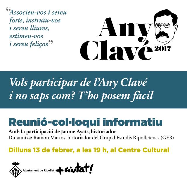 L'Ajuntament de Ripollet ha convocat per a aquest dilluns, 13 de febrer, una reunió informativa adreçada a totes les entitats del municipi per explicar com col·laborar en l'Any Clavé. L'acte tindrà lloc al Centre Cultural a partir de les 19 hores. La reunió-col·loqui comptarà amb la presència de l'historiador Jaume Ayats, i estarà dinamitzada per l'historiador del Grup d'Estudis Ripolletencs Ramon Martos. Una d'aquestes entitats que hi col·laborarà serà la Societat Coral "El Vallès", la qual celebra aquest any el seu 140è aniversari.