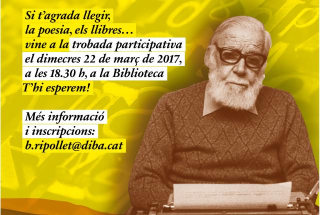 El proper dia 22 de març, a les 18.30 hores, la biblioteca acollirà una trobada participativa a la qual estan convidades totes aquelles persones de Ripollet que els agradin els llibres i la poesia i que tinguin interès a prendre part en aquest procés de reinauguració de la plaça Pere Quart. Tot i que no és imprescindible, qui vulgui participar en aquesta trobada pot enviar un correu electrònic a l'adreça b.ripollet@diba.cat.