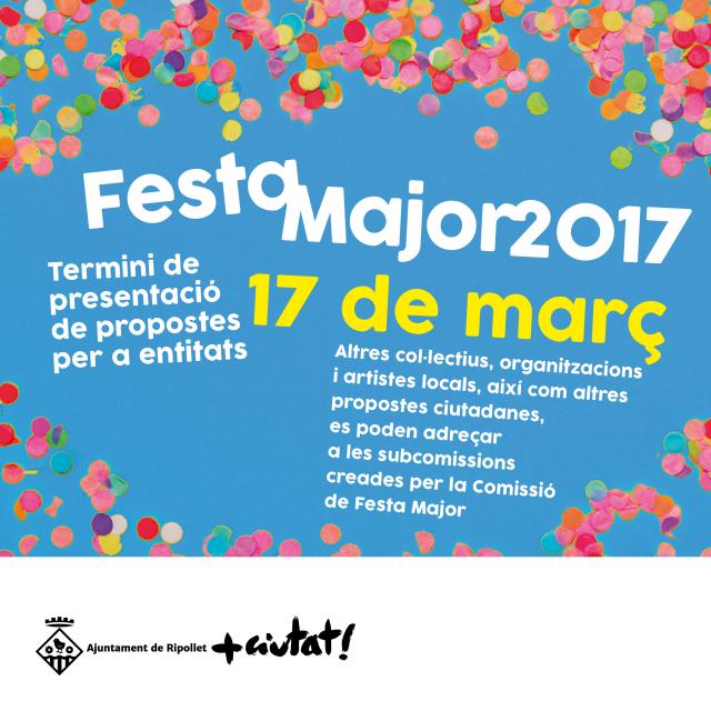El 17 de març finalitza el període perquè les entitats culturals, juvenils i esportives de Ripollet presentin les seves propostes d'activitats per a la propera Festa Major. Altres col·lectius, organitzacions, artistes locals i les propostes ciutadanes es poden adreçar a les subcomissions creades per la Comissió de la Festa Major.