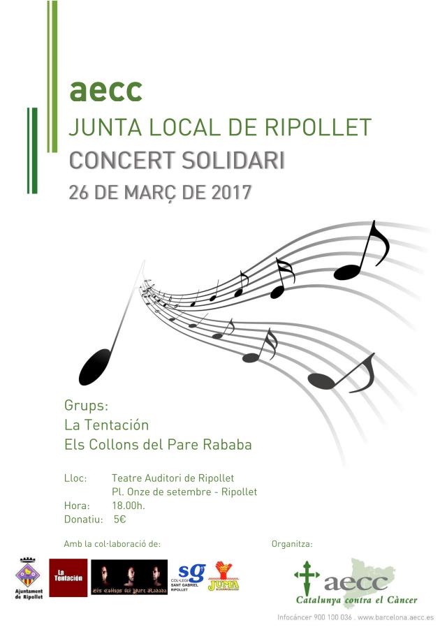El Teatre Auditori del Mercat Vell acollirà aquest diumenge 26 de març, a les 18 hores, un concert solidari per a la lluita contra el càncer. El preu de les entrades és de 5 euros i la recaptació es destinarà íntegrament a aquesta lluita. El concert és l'activitat central que organitza la Junta Local de l'Associació Espanyola Contra el Càncer (AECC) per commemorar el Dia Mundial Contra el Càncer. En l'organització del concert, l'AECC de Ripollet ha comptat amb la col·laboració de l'Ajuntament de Ripollet, l'Escola Sant Gabriel, el supermercat Juma i els grups musicals La Tentación i Els Collons del Pare Rababa, que actuaran gratuïtament.