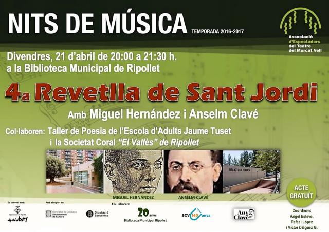A les vuit del vespre, a la Biblioteca Municipal, tindrà lloc la 4a Revetlla de Sant Jordi, on el taller de Poesia de l'escola d'adults Jaume Tuset i la Societat Coral "El Vallès" realitzaran un homenatge a Miguel Hernández i a Anselm Clavé, un acte emmarcat també en l'Any Clavé.