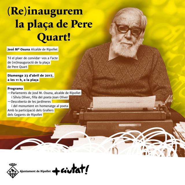A les onze del matí es (re)inaugurarà la plaça de Pere Quart amb un acte que comptarà amb la presència de Sílvia Oliver, filla del poeta sabadellenc i dels Grallers dels Gegants de Ripollet. En aquest acte es descobrirà un monument al poeta sabadellenc, obra de l'escultor Salvador Mañosa. A més, a les jardineres de la plaça es col·locaran fragments de l'obra de Pere Quart, escollides durant la jornada participava realitzada recentment a la biblioteca.